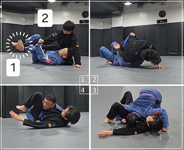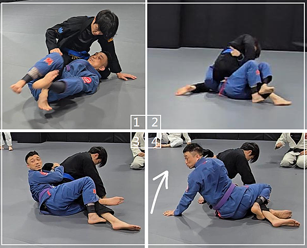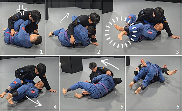 這招的起點也是從 Jordy 教練擅長的蝴蝶勾 (Butterfly-hook)開始,然後他居然用腳一勾加上肩膀一抵地,非常滑溜的從敵人雙腿後方出來到優勢位置,結果眼睛解析度差的我,都看成母雞下蛋了。