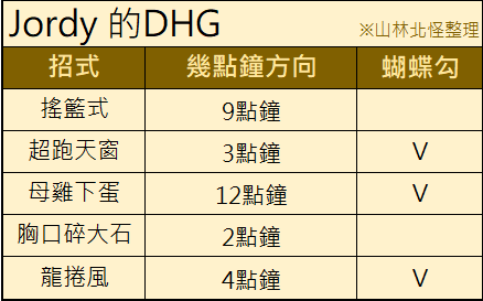 Jordy 教練說他喜歡在喜歡在 DHG 時加上蝴蝶勾 (Butterfly-hook),這讓 DHG 如同長出具有凶猛性的利牙(可以說是:非常匈牙利!),他喜歡甚麼時間點 Sweep 就甚麼時候 Sweep,不用再看黃曆〈請注意,這裡有雙押喔〉。