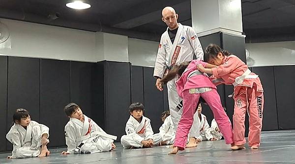 JP 教授考慮這堂課幼兒們的程度,今天特別採用側摔的技術,所以繼續把如何完成這個摔法教完。