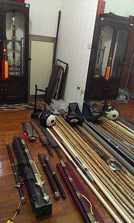 山林北怪記者在這年這月的這一天,來到台灣唯一經過大陸張隨勝大師授權的拳館-忽雷架太極拳楠梓會館,牆上掛了深奧的內經行氣的圖表,和忽雷架歷代祖師的繪像,難得的是看到網路上罕見李景延祖師的圖像,後方有各式散打護具和太極尺,前方有各式古刀劍和杆桿,這天不是他們正課,於是記者和黃館長(江湖上人稱:熊貓王)和台南班的小馬老師,和新進學員茄子哥閒聊。