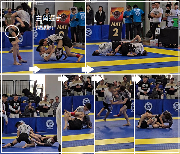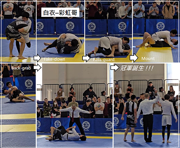 對手想衝進來做Single-leg失敗 → 彩虹哥以arm-in斷頭台方式控制並帶到地板 → 對手拿到Half-guard → 彩虹哥Knee-slide-pass-guard → 彩虹哥取得Mount位置 → 彩虹哥取得 Back-grab 位置並勒頸 → 對手拍拍投降了