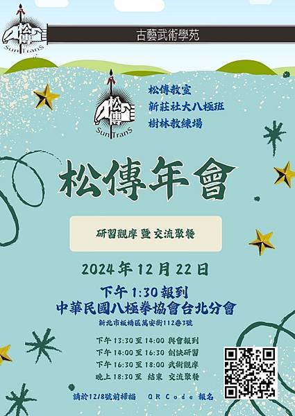 小編在 2024年12月22日來參訪〈松傳分會〉的武術觀摩,這是八極拳協會的〈松傳分會〉所主辦的活動,今日的武術觀摩是由松傳分會《古意武藝學苑》的教練、學員和受邀者來表演,而《古意武藝學苑》包含三個練習場: