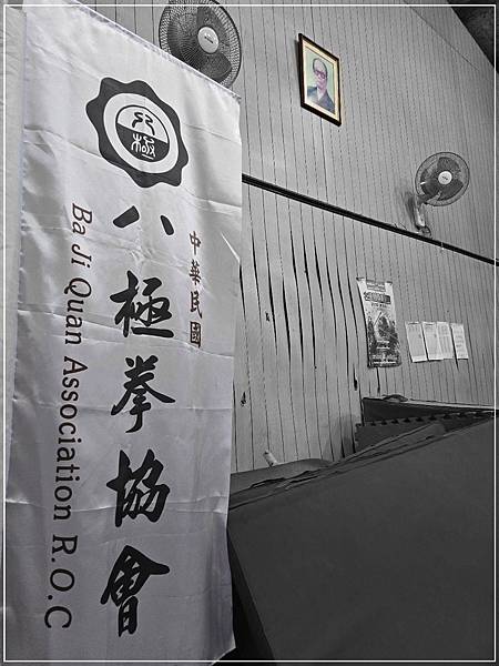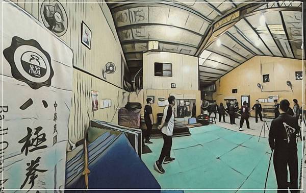在正面牆上有劉雲樵宗師的掛像和大槍的國際賽海報,地板有分軟墊區和硬地板區,空間深度也可足夠讓大家練習大槍,這個練習場可以說是為了各種武藝的練習所設置。