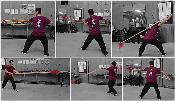 〈九節鞭〉由李棟樑教練演練,一開始李教練將手中成團的九節鞭甩出,小編覺得:「為何他邊甩出九節鞭身體邊舞動,為何都不會被長鞭纏在一起呢」?這其中必有學問在才是。像是小編這種〈憑實力外行〉的人來看,這個可以收納到一手抓握,又能甩到長兵器的長度,根本是課本中具備「大丈夫能屈能伸」氣節的兵器,他更是利用肢體特性,來控制兵器的各種長度和攻擊角度,後來小編經高人指點變得稍微「內行」一丁點,於是得知「九節鞭有粗細輕重之分,李教練選用重量級的材質」,如此的動量和力矩使得舞動更加不易,正如「水之積也不厚,則其負大舟也無力」,內行的人必能看出李教練的高深功力,已在空中化成令人讚嘆的「靈動功力鏈」。