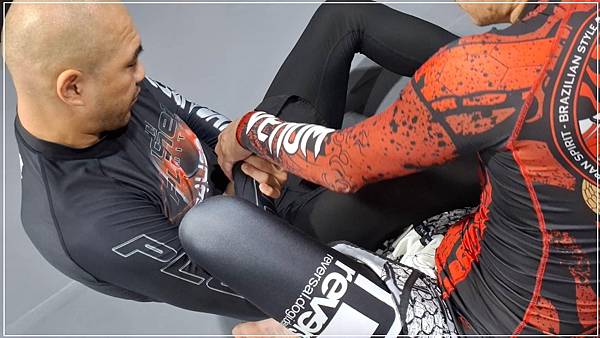 今天有位穿整套柔術盔甲(防磨衣–格鬥褲–壓縮褲)的紫帶哥,柔術界人稱〈幫主小瓜呆〉,腳踏兩束三星蔥,便上場跟 You 教授討教 Rolling 了。