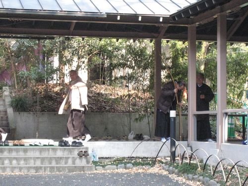 後來記者只能在第一館側邊, 拍另一些阿伯拿弓走來走去的樣子(注意看:他是用時代劇大臣一般, 很有氣式的走路方式喔), 想說我的 "明治神宮武道場"之旅至此已屆尾聲....