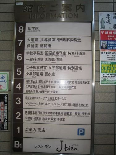 而在參訪當天, 我在水道橋附近問日本人「講道館」,他們都知道都跟我說要怎麼走,當天我就順大通走,看著路上的地圖,居然講道館變成一種地名,像是台灣XX文化中心地標般印在地圖和指標上面,講道館這樣的大廈,其實沒有很醒目的招牌,只能看著高處他們的小mark才知道快到了,記者心想那麼小那麼高的招牌是給蜘蛛人看嗎?