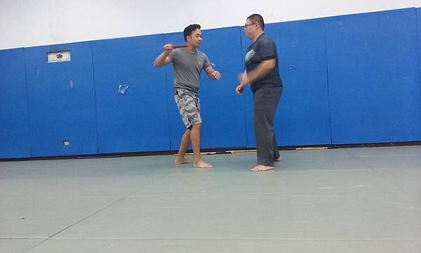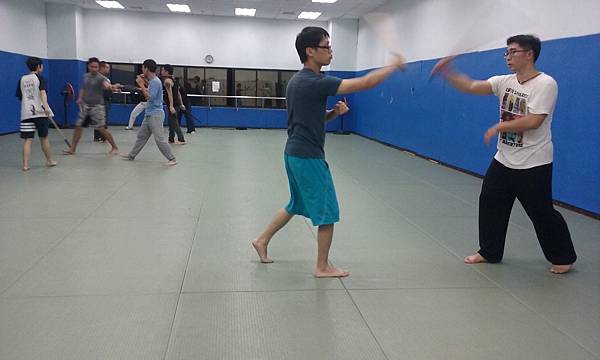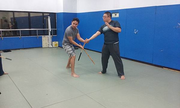 很快的複習部分結束了,Kiko教些技巧性強的對招,像是『單棍對單棍敵方下劈‧基本奪杖法』〈小編差點在前面加上『真』了〉,這招奪杖根本面面俱到事先擋下他會打到腳的勢,又專轉向他的死角奪杖,退半步製造魔杖完美的最強力攻擊距離,壓熄敵人最後反撲的一絲絲希望〈酸民:攏侯你降屌屌抖後阿〉。小編看到最旁邊那組,來自馬來西亞的刺青哥,身上半甲刺青為他的攻擊添加許多煞氣,敵人根本就是被他手臂上的龍嚇到,才被打到咪咪茂茂的吧?〈小編溫馨小叮嚀:不是打到咪咪,話要看完〉
