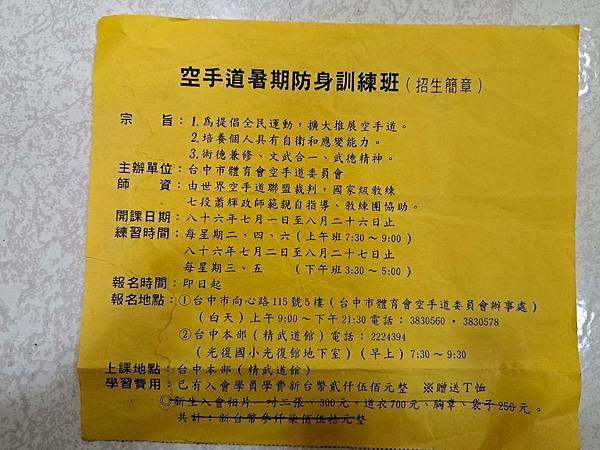 提到棕帶哥他一開始主要是在「台中市精武空手道館」跟蕭輝政師範和各教練學習,後來也在雙十國中對面的體院體育場邊跟蕭輝政師範學習,最後也在逢甲大學空手道社和蕭輝政師範及蕭勝如教練學習,總之都是跟蕭輝政師範體系學習空手道!