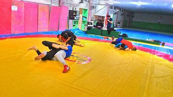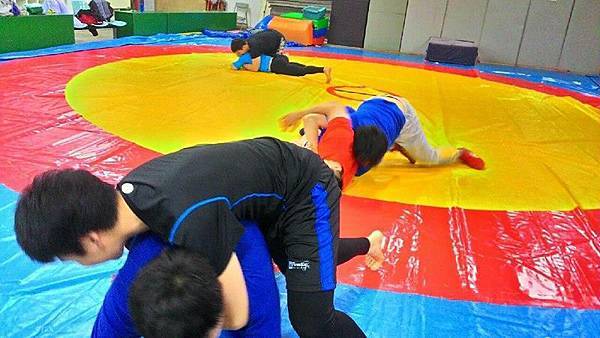 上課前有個穿柔道服的小朋友來了,記者想說他是否走錯地方, 他居然說他故意穿來的〈小編突然覺得他怕冷〉,小編覺得小時如此神回應,長大後會過著每日最中肯的日子。一開始由何教練帶領大家做熱身,大家繞著角力場跑了無限迴圈後,開始做很多種滾翻,像是前滾、後滾、斜滾、滾完站起來、滾完劈腿〈小編偏好泡麵滾完再 吃〉,最後階段是扛人練習,動作有塔褲魯、肩車、巴著烏龜身體前後翻、還有下腰練習。