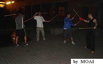 後來他們都雙人一組做套招對敲練習,以習慣棍勢和力道,最後由李麥克老師示範好幾個用法,像是類似以日本傳統柔術的擒拿來奪棍,或是用棍子來勾抱腿摔倒敵人,在攻擊特色上,他進退有度用棍靈活,充分發揮國術說的『兵器是手臂延長』的理論!