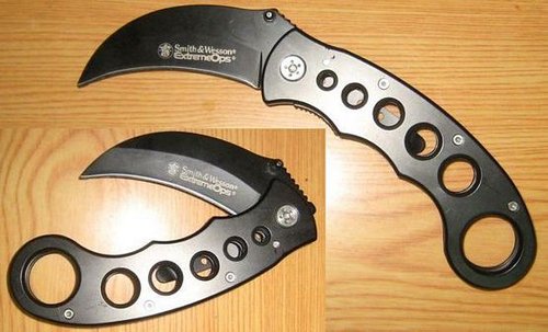 (左)靓刀收藏家N君新刀開箱圖, 購自興武們, N君說他兩天後已經習慣單手開收刀, 此刀刃上面有一個小鐵製圓柱, 應是幫助開收刀的機制,N君說猜是否刀是適合右撇子開刀, 不適合左撇子? 因為應該小鐵製圓柱右手開刀卡順, 有人推薦小刀卡褲子口袋開刀方式, N君測試過覺得缺點在於牛仔褲口袋不夠厚, 所以很難控制用口袋開刀的方向和穩定出刀力道; N君修正成:用口袋縫合處那邊斜上45'開刀, 或是太瘦有髖骨, 用寬骨水平開刀, 會比較好控制力道