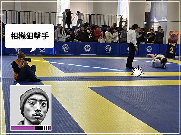 大會還有專屬的攝影人員,你也知道這邊任何一個人都是大有來頭的,攝影師 Jordy本身是BJJ紫帶三槓程度,坐在中央的他整個氣場涵蓋四個賽場,畢竟是紫帶高手的他,選擇以 Sit-up-guard 的巴柔招式面對大家,毫無遲疑的以Camera-submission 打得大家無法反抗,這些都不是小編瞎掰,之後都有美美相片為證!