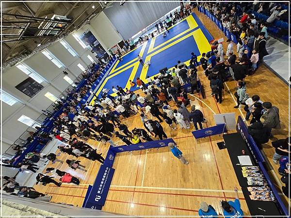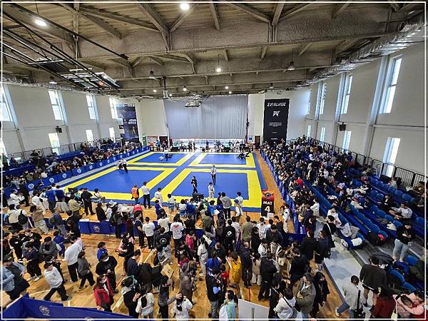 三樓是分為四個比賽場地同時進行比賽,上場入口也是過磅區,還有兩三個攤位在賣柔術相關衣物,小編直覺衣服檢錄沒通過的人都來這裡買合格衣物,但是那邊沒有甚麼顧客,我怕一過去看看就會被〈走過路過不要錯過〉洗腦,只好保持距離用餘光觀察了,其他地方和走道就是擠滿了人,視線很難直接看到比賽情形。