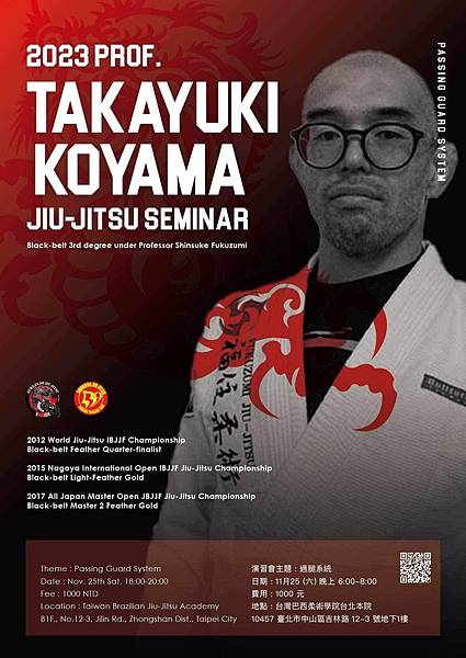 日本大叔小山貴之隸屬日本名古屋的福住柔術,本身是巴西柔術黑帶三段,這次研習會呢是小山老師在台灣的第一個研習會,他的技術總是會在某些點讓人出乎意料以及發人省思。本次研習會是以過腿越位(pass-guard)為主題。
