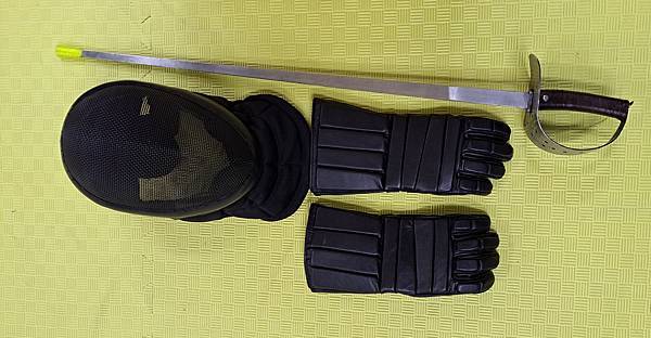 今天是由劉宗恩教練所教授的「晚期英式軍刀, sabre」,他影響到今日擊劍運動中的軍刀項目 (Saber),記者看他們所使用的鋼製軍刀,半邊的劍柄有護手包覆,它相比其他長劍較為彎曲,上課的學員們都會準備自己的擊劍頭盔和手套,記者試戴擊劍頭盔看看效果如何,結果用鋼製軍刀來敲打和刺擊完全沒痛感,完全符合網路上說的「傷害性不強,侮辱性卻極強」,我想企鵝東東每天被一堆人打都打不死,一定有配戴此般神器。
