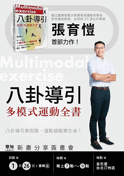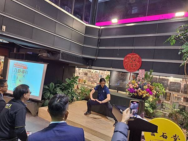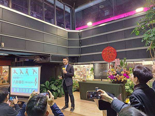 然後主持人介紹張教授出場了,這麼英姿煥發的人生勝利組的外型,這會是著名的武術家嗎?怎麼跟我想的不一樣(我本來想說是像黃飛鴻那樣飛下來,然後跟大家要盤纏的說),張教授介紹八卦導引的『四身二文之美』原則:(健身、養身、防身、修身、文化、美學),在『養身』的效果上,有學生因為練習八卦掌而明顯改善了久疾的困擾。張教授繼續介紹新書,不僅是平面圖片解說,還可以掃 QR-code 觀看影片練習,更可以依照自己的進步速度切換更大強度的模式,這個創舉已經開創閱讀的新潮流了。