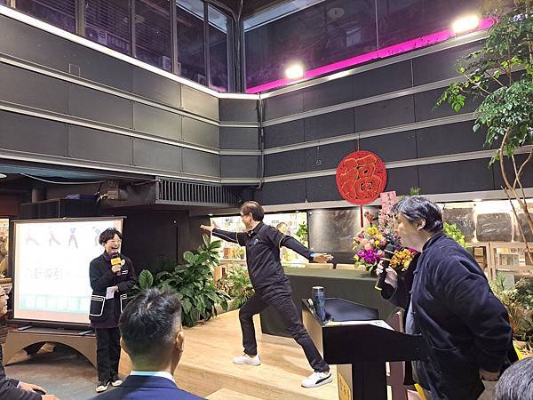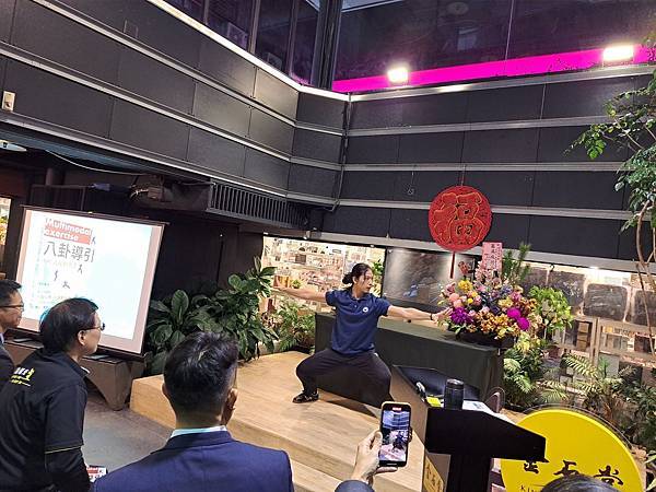 接著就由上台演練八卦掌招式的,是張教授 EMBA 的學生和他的現役研究生馬尾哥,『現役』用白話解釋就是『還沒畢業啦』,這兩位充分展示『伸筋拔骨』與『擰翻走轉』的特色,像小編這種外行人,偏要死巴巴看到有繞圓圈才相信這是八卦掌,還好馬尾哥在狹窄舞台走了最小的圓圈,滿足了我們這些外行人們的想像!