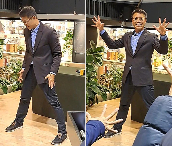 之後張教授帶著現場大家一起來帶動唱,喔不,應該說是『大家一起來八卦』,於是大家站起來一起練八卦囉,張教授要大家把手指充分張開(像小編是直接 cosplay 壁虎守宮的手這樣 kuso 比較快),然後下蹲成馬步後,隨即雙臂張開再站起,站定後十指如同樹根一樣往天空無限深入(武俠小說迷應該會懷疑這是不是在練九陰白骨爪),這個動作做三次,分別要去拉肩膀、肋旁肌、腰部,每一次我都覺得天公伯把我抽高一點,抽了三次總算長大成人的概念,差點沒唱出張雨生的歌:『我要和天一樣高~尋找一種美麗的情操~』,對了是(和天)不是寒天喔!