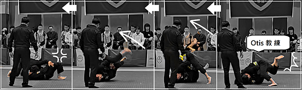 小編在現場隔著一個賽區錄影對面 Otis 教練的賽事,這場他都壓倒式的進攻,這場真是贏的理所當然,但這其中很值得講得是一個 Open Guard 接神奇的 Pass Guard ,可真是“Oh! My Guard”!