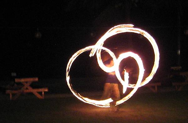 然後呢,晚上住的旅社一定要選很靠近海,才能跟那些深居內陸的陸客展現出一種『我是海之子』的優越感,在旅社吃晚餐時,旁邊有人似乎在木棒上點火飛舞,小編仔細看看是否內含菲律賓魔杖招式,後來才發現他們使的不是木棒而是繩子(採訪筆記:原來菲律賓武術也有繩標)。