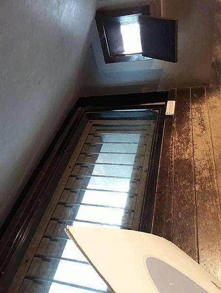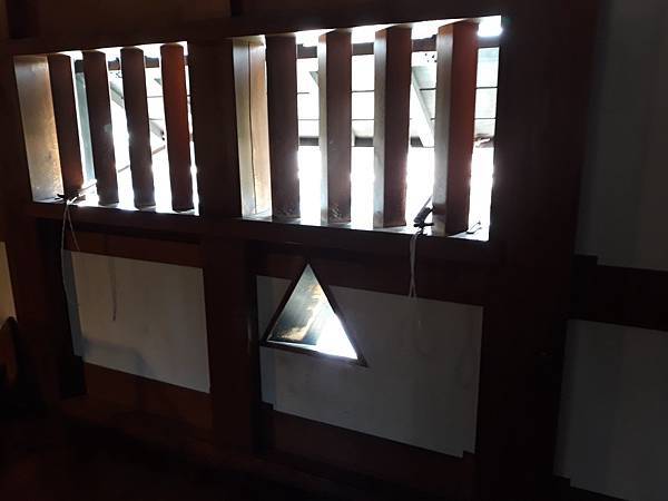 樓上不起眼的角落也有戰爭的機關,像是下圖牆上的洞是應敵之用,若弓箭攻擊的狹間稱為「矢狹間」,而使用鐵砲則稱「鐵砲狹間」;地板上的洞呢是落石窗「石落,Do-Shi」,其實這些機關千萬別讓某補教歷史科名師呂捷知道,不然他應該會說別浪費弓箭耗費高成本,趕快蒐集城內大大小小的便便,傳便便後用水肥車在「屎狹間」來噴死你,還能將功績拿去補習班當教材必定讓學子上台大,於是廣島城戰略不敗且子孫有才,萬世必當世襲不斷!