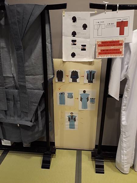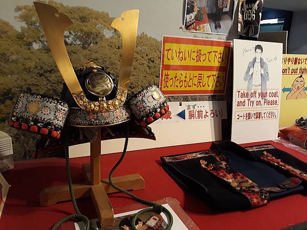 一樓還有讓遊客試穿簡單的和服或是戴上頭盔和盔甲來拍紀念照,碰巧有個白人和日本妹的情侶在拍上面頭盔,為何女生講英文我還知道他是日本妹呢?因為他還是有日文腔,然後和服這邊有日本武士衣服穿法示意圖,正好也有個小姐穿上和服在拍照。