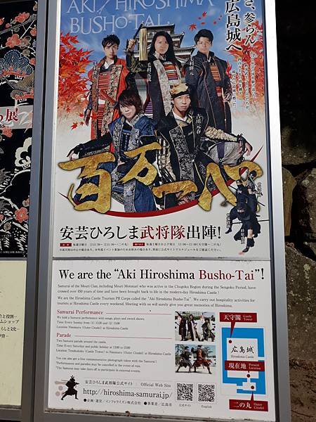 到了城堡最頂端可以出來眺望廣島市區,只是上面都是中國大陸和韓國人鬧哄哄的,出了城堡區域,看到下面海報,似乎聽聞周日武士表演的團體或許是他們 — 安藝武將隊,不過在小編這種武宅眼中他們似乎舞蹈成分較多,還有下盤比較不穩等,如果貼到臉書的武術社團,應該也是會被酸民這樣攻擊吧我想。